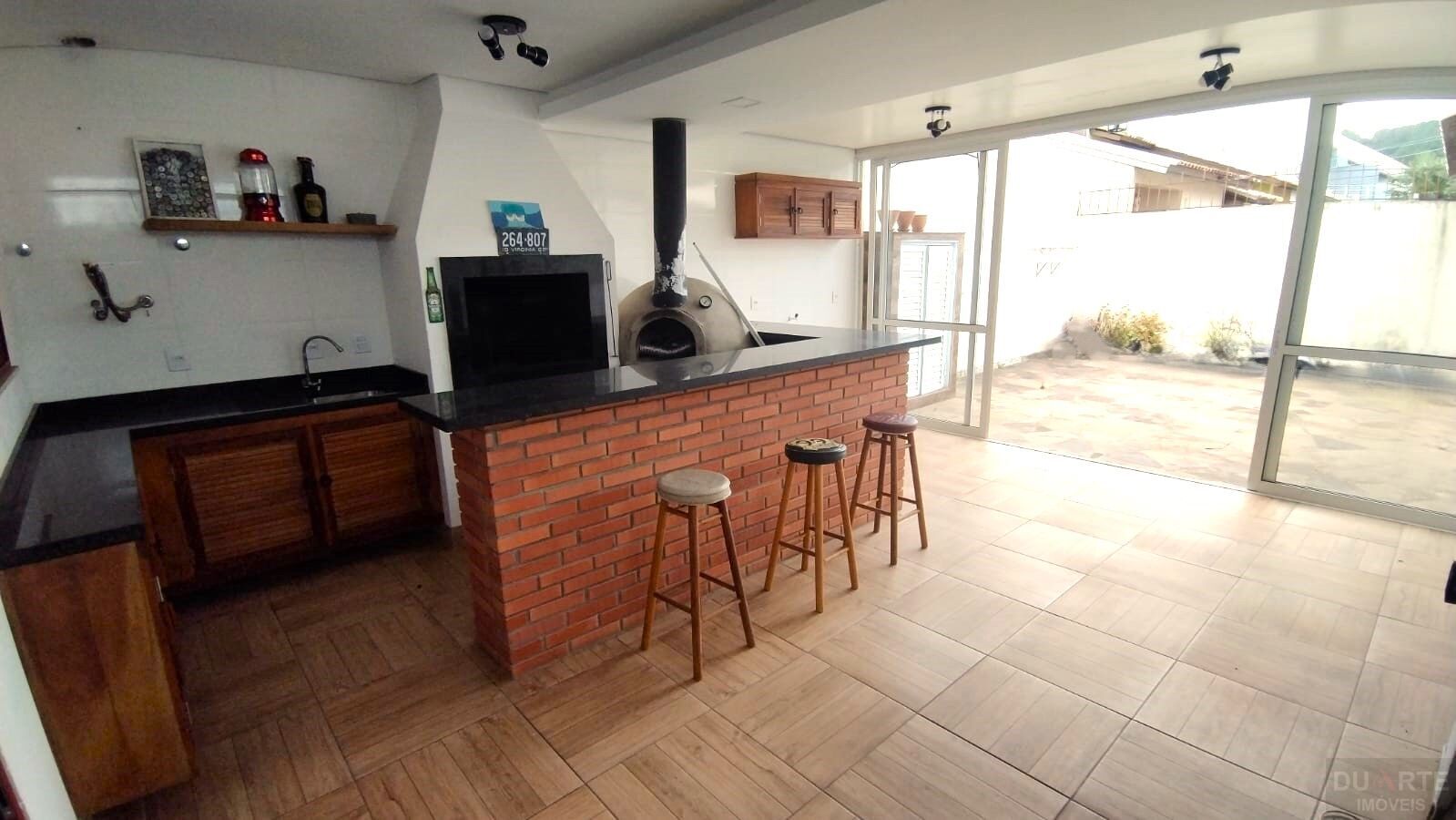 O living é amplo e ideal para receber visitas, com dois ambientes bem definidos, e a cozinha americana integrada facilita a interação entre os espaços. Para os momentos de lazer, a casa dispõe de uma área de churrasqueira com forno para pizza, perfeita para reuniões com amigos e familiares. Além disso, conta com fogão a lenha, que adiciona um toque rústico e acolhedor.